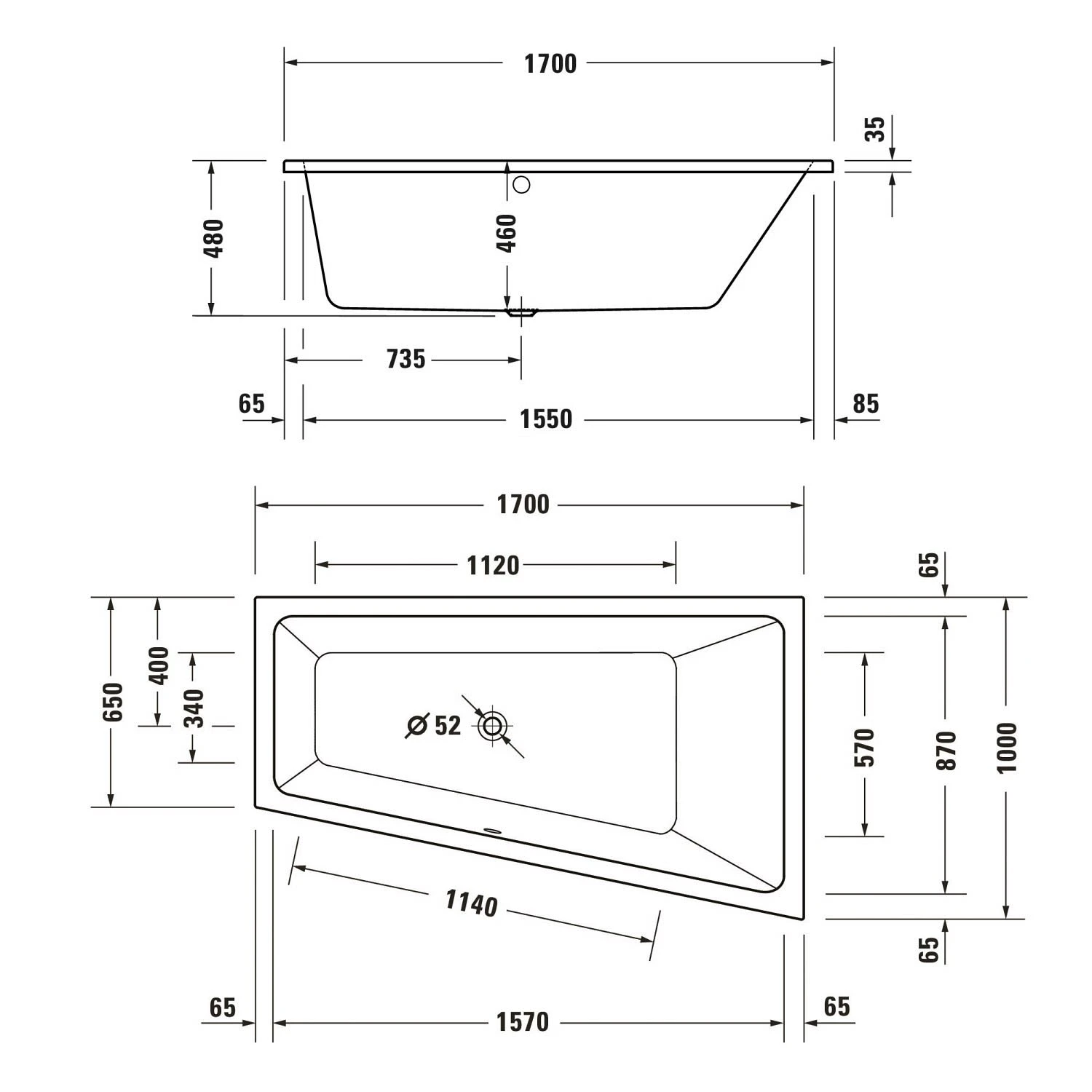 Duravit No. 1 Trapez-Badewanne 170 x 100 cm mit 1 Rückenschräge rechts