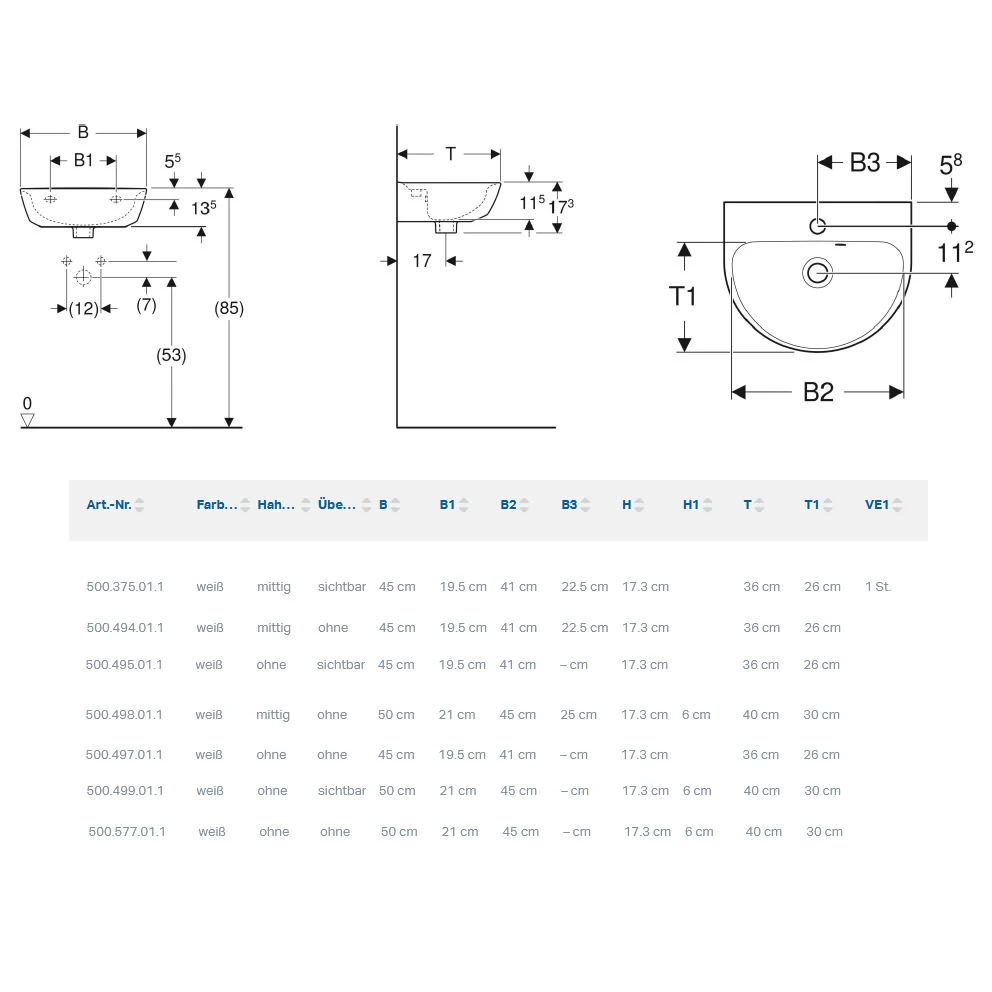 Geberit Renova Handwaschbecken 50 x 40 cm mit Hahnloch ohne Überlauf